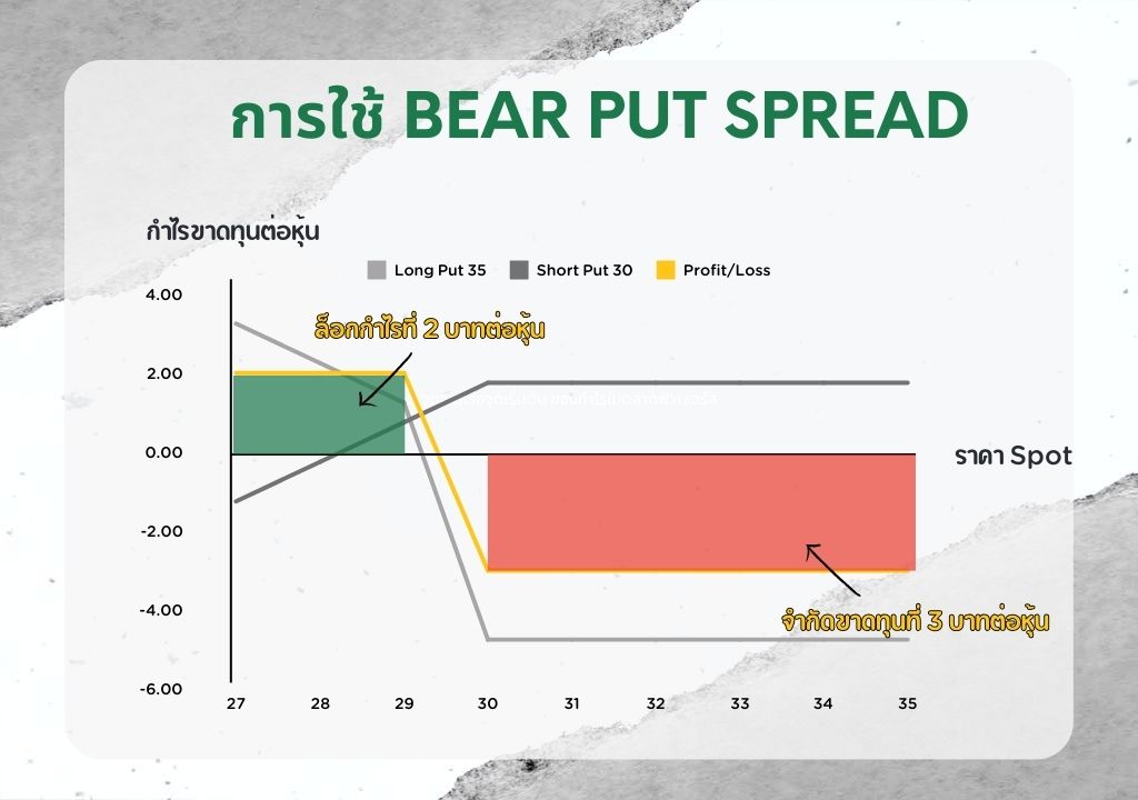 Bear Put Spread เป็นกลยุทธ์ที่ใช้ Spread Order ในการเทรด Option อย่างง่ายเพื่อล็อกกำไรจากส่วนต่างราคาสองสัญญา และลดต้นทุนการ Put ลงได้